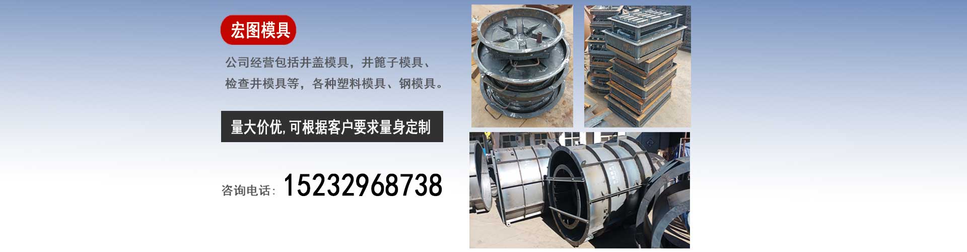 保定宏圖檢查井蓋模具廠是一家集設計、研發、生產、銷售為一體的企業,我廠主要經營:水泥井蓋模具,預制井蓋塑料模具,下水井蓋鋼模具,雨水井篦子模具,排水井篦子塑料模具,污水井篦子鋼模具,混凝土檢查井模具,污水檢查井鋼模具等。我廠的賣的不僅僅是模具,更是一份保障,一份誠信,一份放心,我廠的銷售宗旨是"以誠信為本,做最好的模具,賣最便宜的價格"。保定宏圖檢查井蓋模具廠的模具產品銷往全國的30多個省市區及海外受到了廣大用戶的好評。